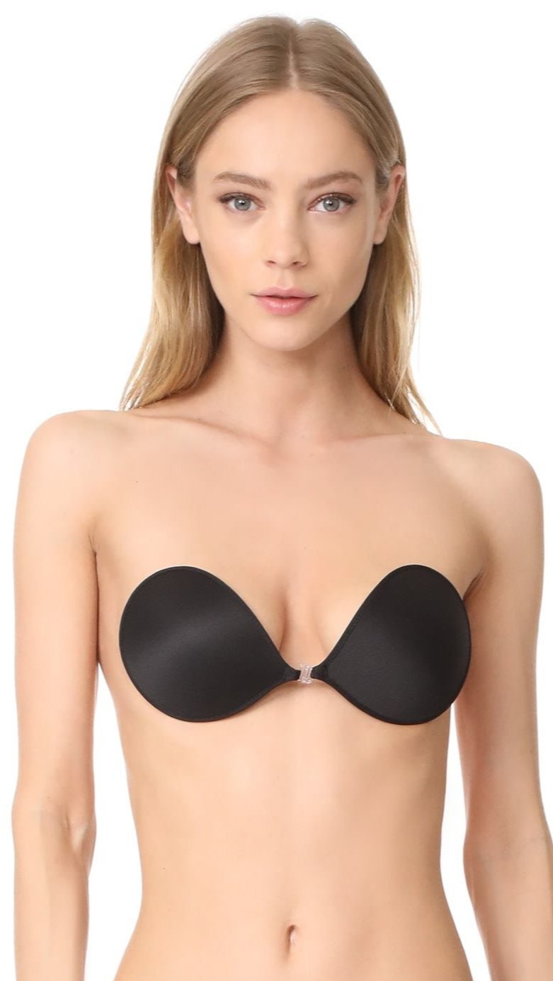 A backless, strapless, self-adhesive bra from NuBra. The unique, super-light design provides maximum support and cleavage without binding bra straps. Each bra is reusable, and adheres to the skin with silicone adhesive. Apply each side, then connect with the clasp in the middle.