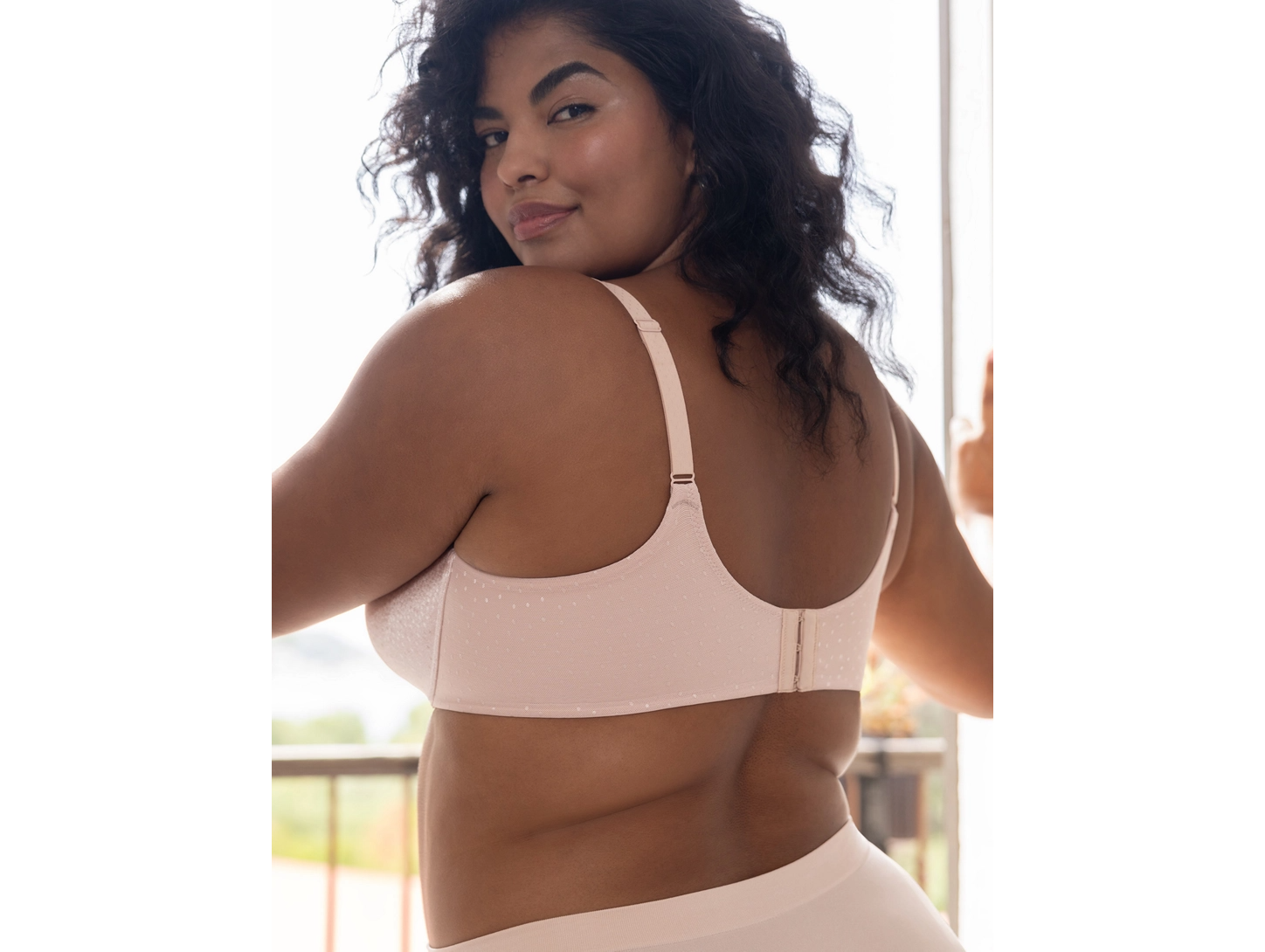 - Full coverage two-ply cups of soft inner fabric covered with pretty dot jacquard fabric with accent sheen